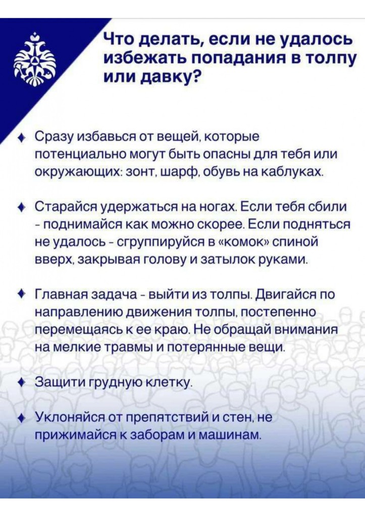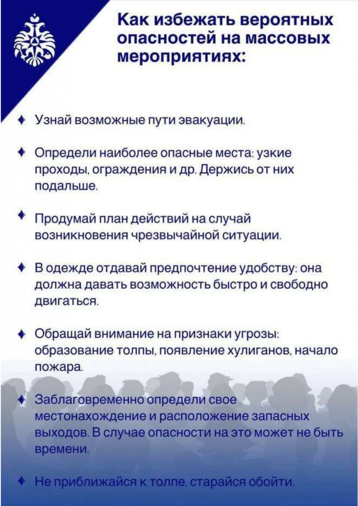 - избегать места скопления людей (рынки, магазины, стадионы, дискотеки и пр.);
